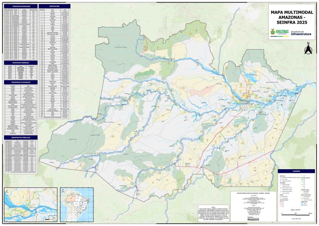 A Secretaria de Estado de Infraestrutura do Amazonas (Seinfra) produziu, de forma inédita e pioneira, um mapeamento completo de todos os modais existentes no território amazonense, com o intuito de facilitar a localização destes meios em cada município e, também, a tomada de decisões quanto à realização de obras de infraestrutura.